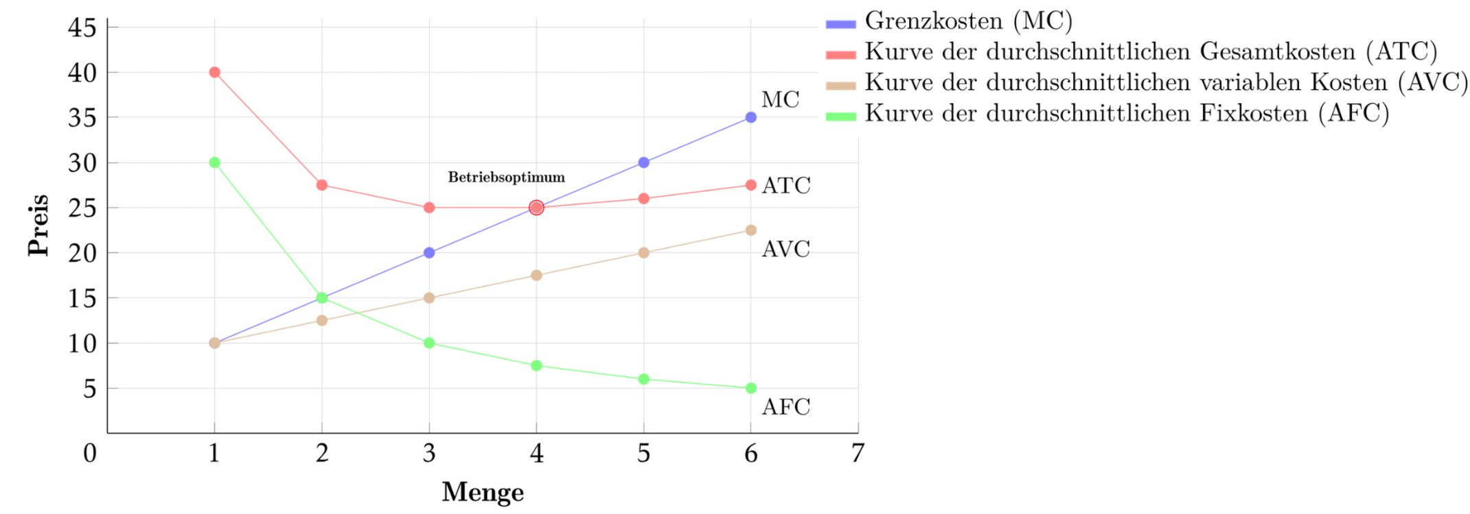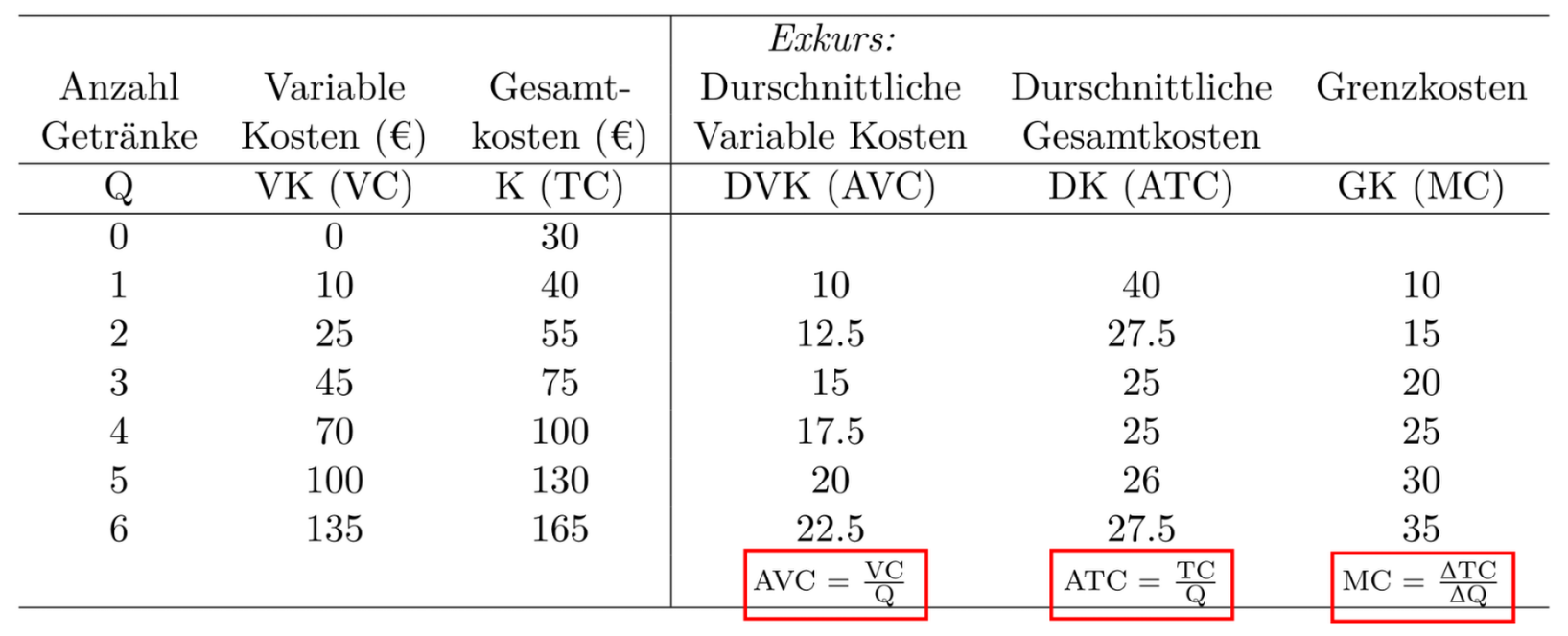 Die durchschnittlichen Fixkosten können auch mittels Differenz aus ATC und AVC gebildet werden. \(\Rightarrow\) AFC = ATC - AVC