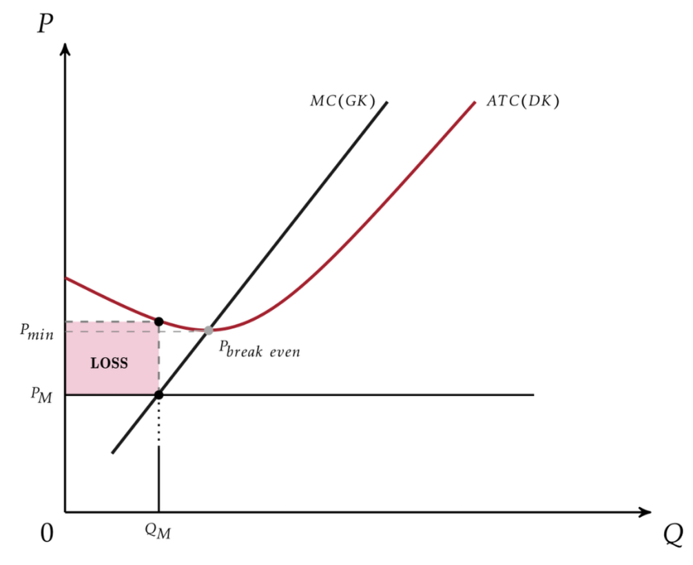 Merke: Ist der erste\ Schnittpunkt vom momentanen Preis PM mit der MC Kurve also unterhalb des Schnittpunktes von der MC Kurve mit der ATC Kurve, so erleidet die Firma einen Verlust (die in Rot aufgezeigte Fläche!). Zur Vereinfachung ist hier die MC Kurve als Gerade gezeigt. Diese hingegen würde in realität auch eher U-förmingig verlaufen, wie die ATC Kurve.