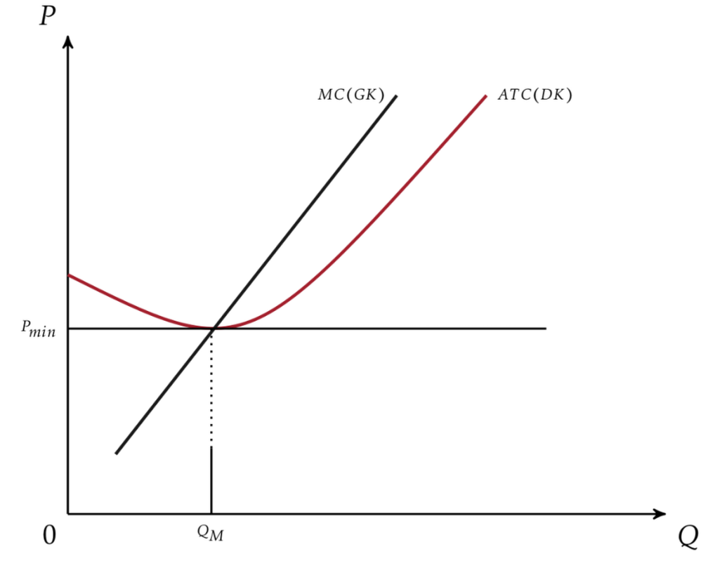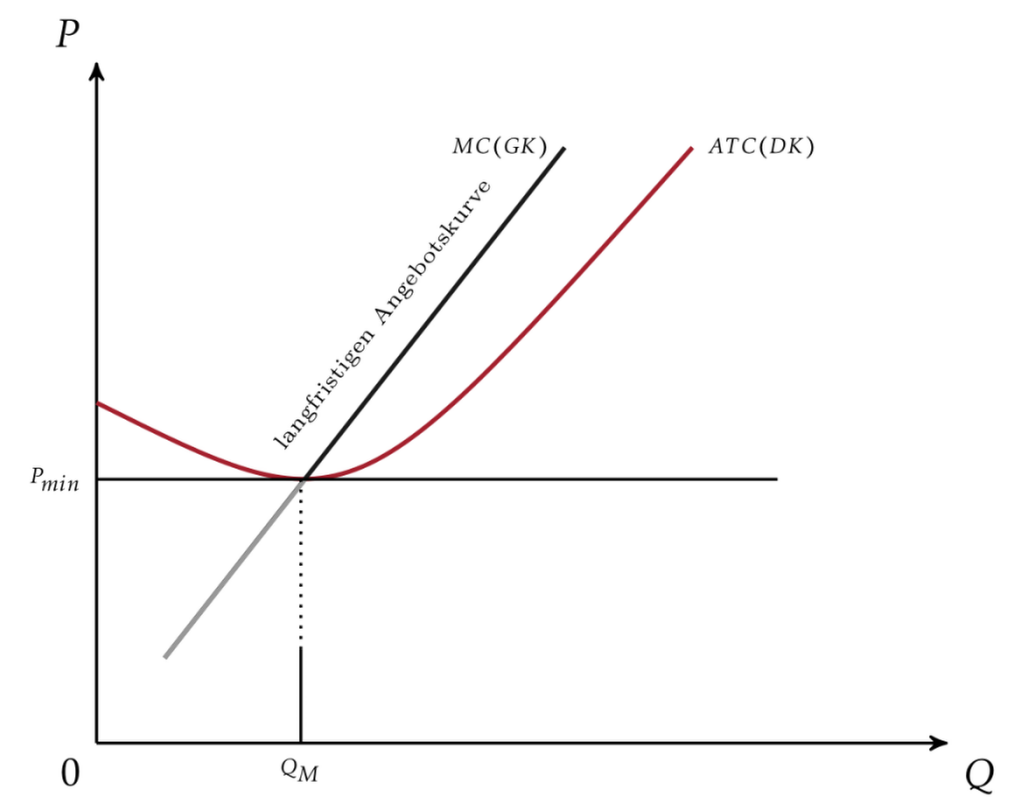 Die Firma würde bei vollständiger Konkurrenz nur noch ab dem Level des Betriebsoptimums Anbieten. Das bedeutet, dass der Schnittpunkt von Pmin mit dem Minimum der ATC Kurve dem minimum Preis entspricht bei dem die Firma in den Markt nur einsteigen würde um Wirtschaftlich zu sein. Ab hier beginnt auch der Bereich der langfristigen Angebotsfunktion und entsprechend auch nur hier auf dem verlauf und Bereich der Kurve würde die Firma anbieten. Jener Preis, welcher unterhalb des Betriebsoptimums liegen würde, würde bei vollständiger Konkurrenz keine Marktfähigkeit bedeuten - reiner Verlust.